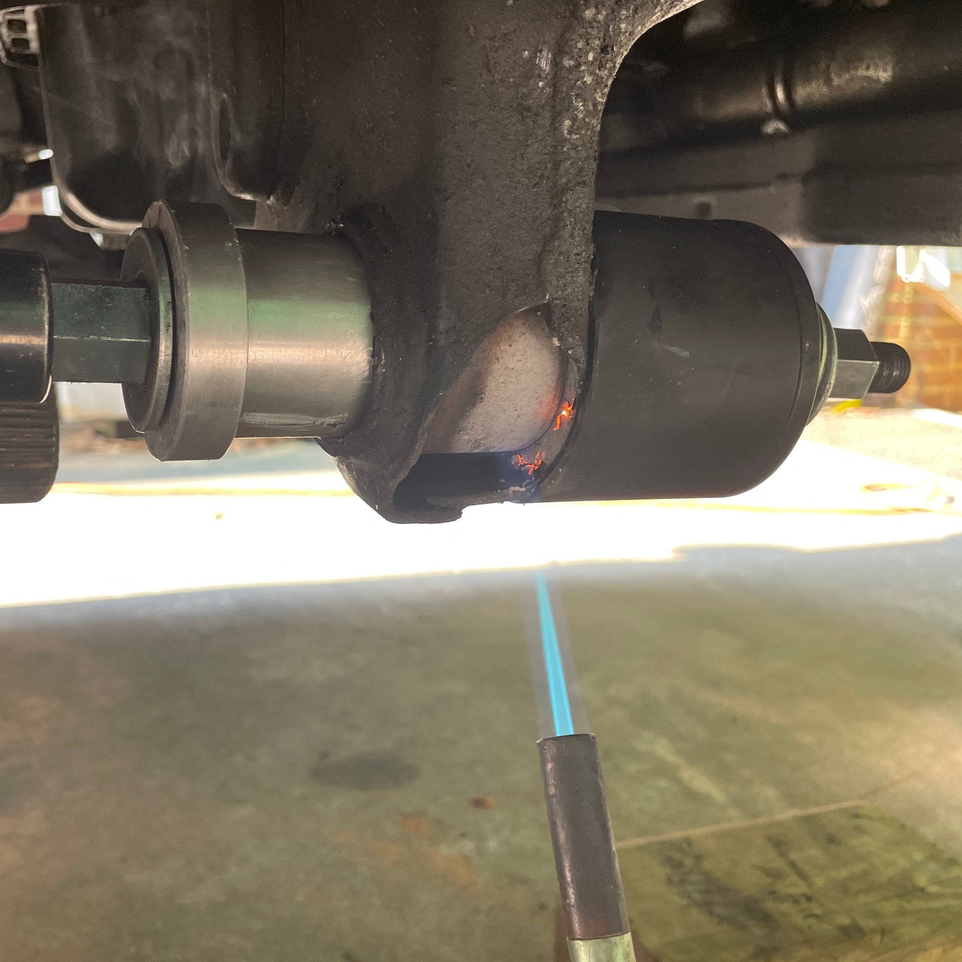 NOTE: A torch is required to heat up the inner surface of the frame and the bushing sleeve. Some smoke is likely as the rubber burns away. Depending on the amount of rust on your vehicle, more heat and/or force may be required.