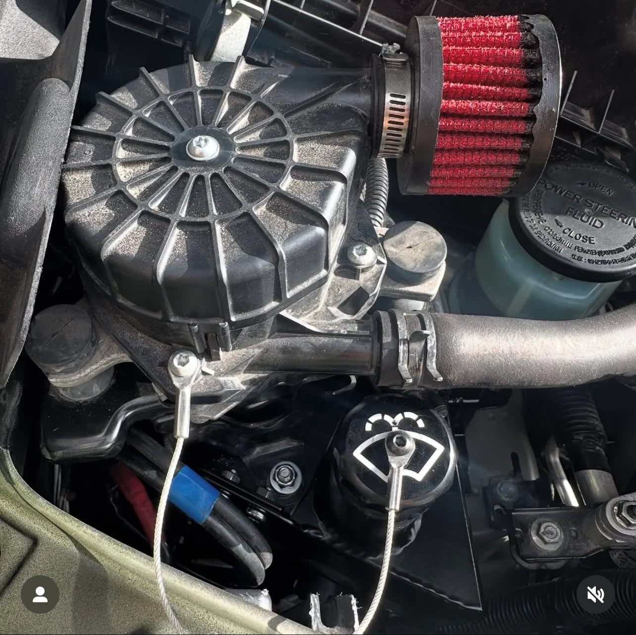 This new aluminum tank bolts right into place with no modifications to the wiring harness or plumbing. It uses the existing holes for the secondary air injection pump and comes with an aluminum bracket to relocate the air pump to the top of the washer fluid tank.